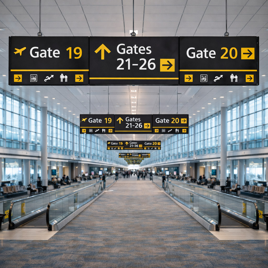 The modular airport wayfinding signage system creates a clear and consistent navigation experience across long terminal corridors using uniform typography, high contrast directional arrows, and standardized aviation icons. Suspended modular panels allow scalable deployment across large airport spaces while maintaining a cohesive visual identity and easy update of gate information.