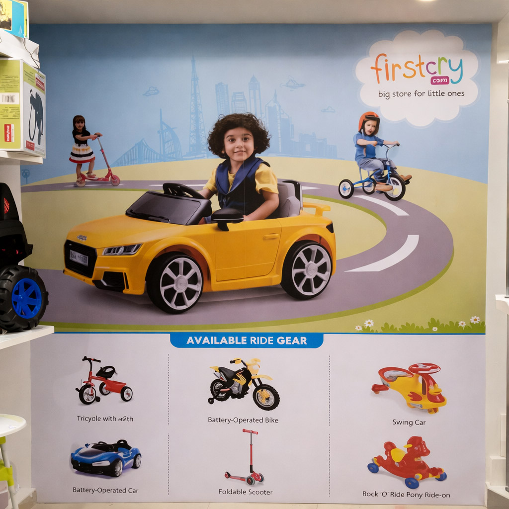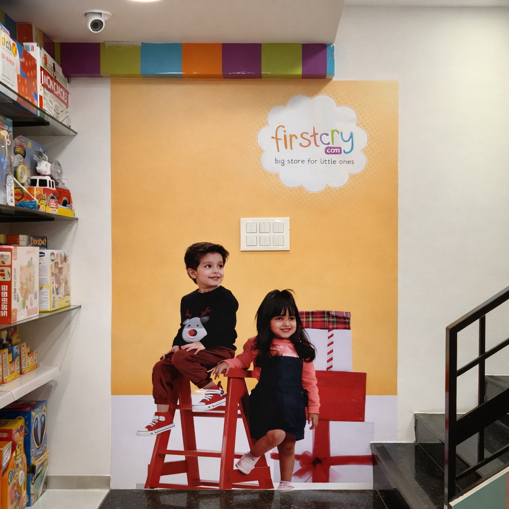 Large format wall branding installation for a FirstCry retail store featuring vibrant printed graphics, brand messaging, and product visuals. High resolution commercial print enhances in store branding and customer engagement.