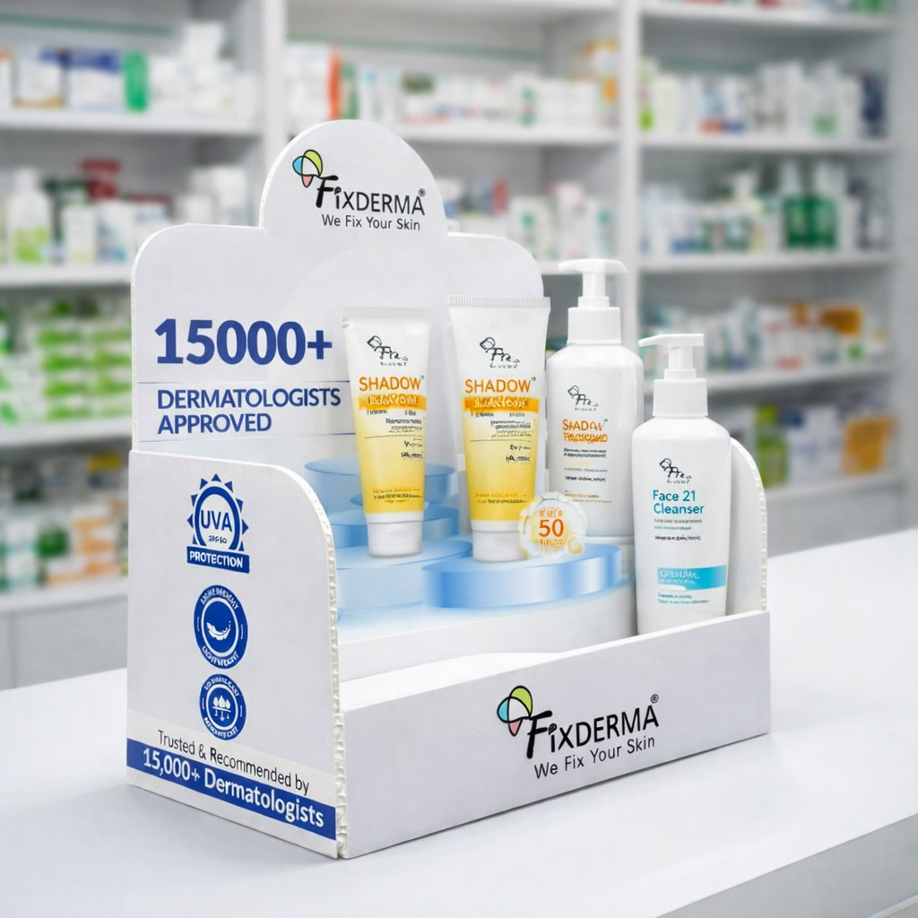 The Fixderma POSM display is designed to showcase dermatology skincare products in pharmacies and retail counters with clear brand visibility and product organization. Its compact countertop structure highlights key product benefits and attracts customer attention at the point of purchase.
