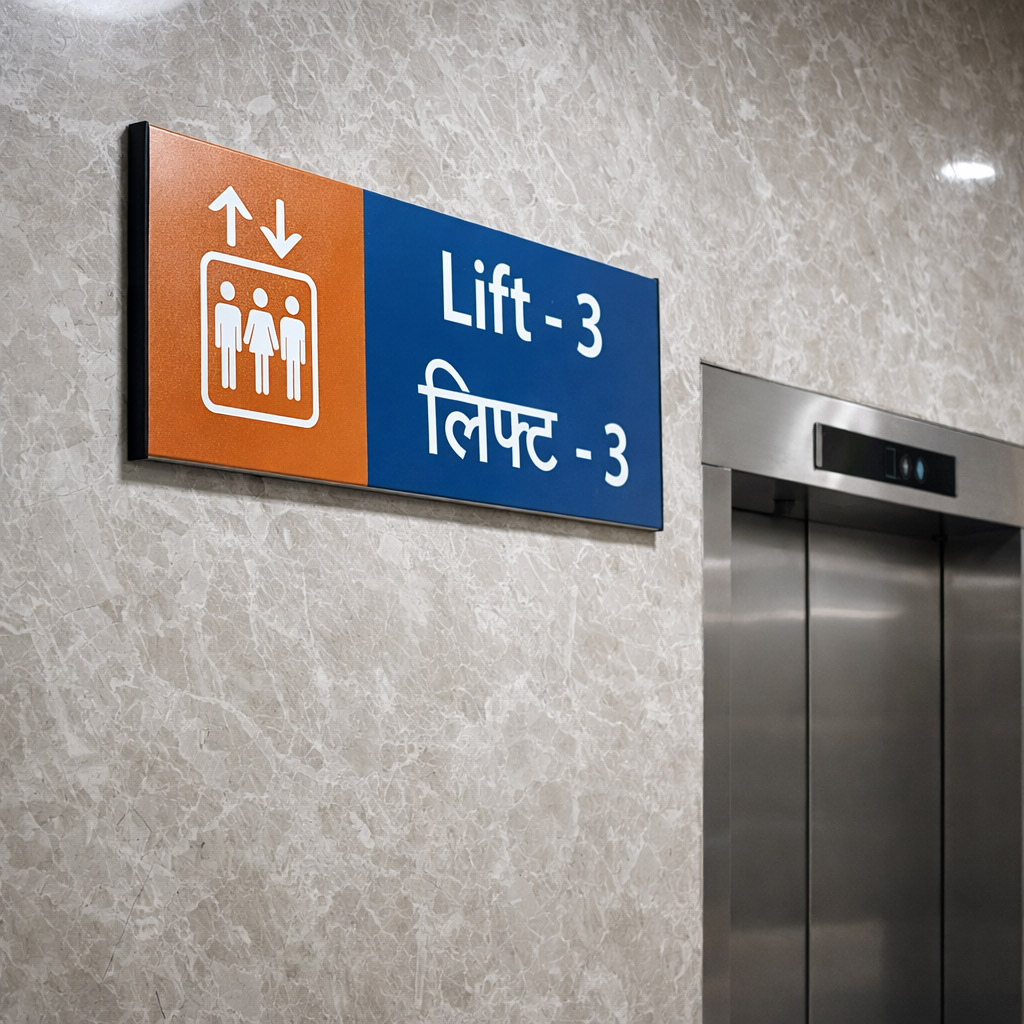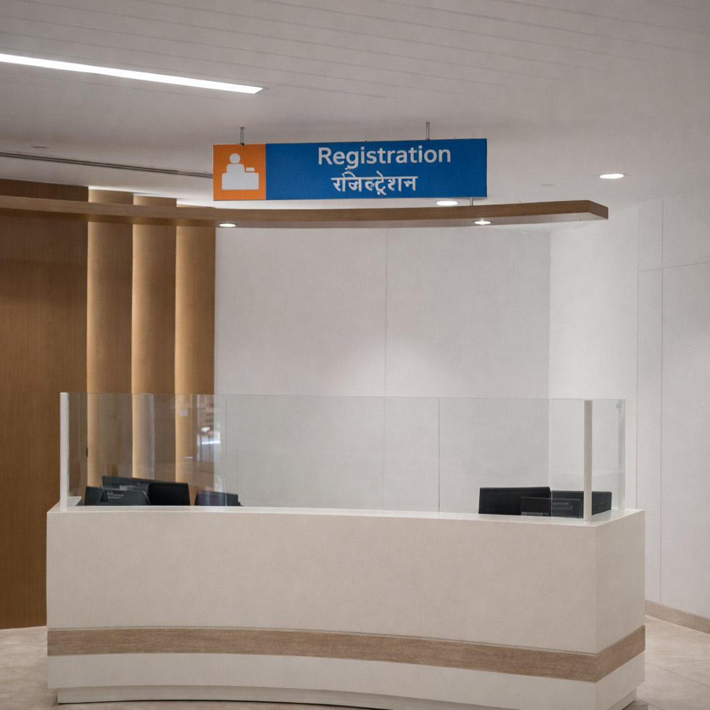 A modular signage system installed across Shri Ganga Ram Hospital provides clear and consistent wayfinding for patients and visitors, guiding them to key areas such as Registration, OPD departments, Lifts, Diagnostics, ICU, and Operation Theatres. The standardized panels use uniform colors, bilingual text, and clear icons to ensure quick navigation across multiple hospital floors and departments.
