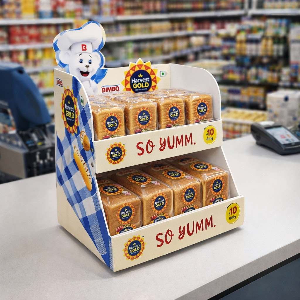 The Harvest Gold POSM display is designed to attract shoppers with strong shelf visibility and clear brand communication in modern retail environments. Its structured multi tier design highlights the product range effectively, encouraging impulse purchase at the point of sale.