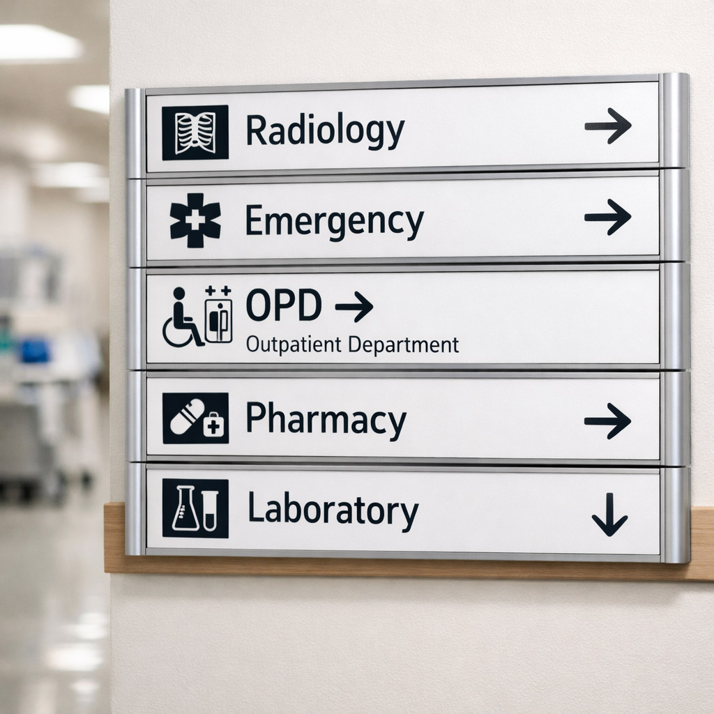 A modular hospital wayfinding signage system with clear typography and universal medical icons guides patients efficiently to departments such as Radiology, Emergency, OPD, Pharmacy, and Laboratory, while the brushed aluminum frame structure maintains a clean and standardized navigation system within a modern healthcare environment.
