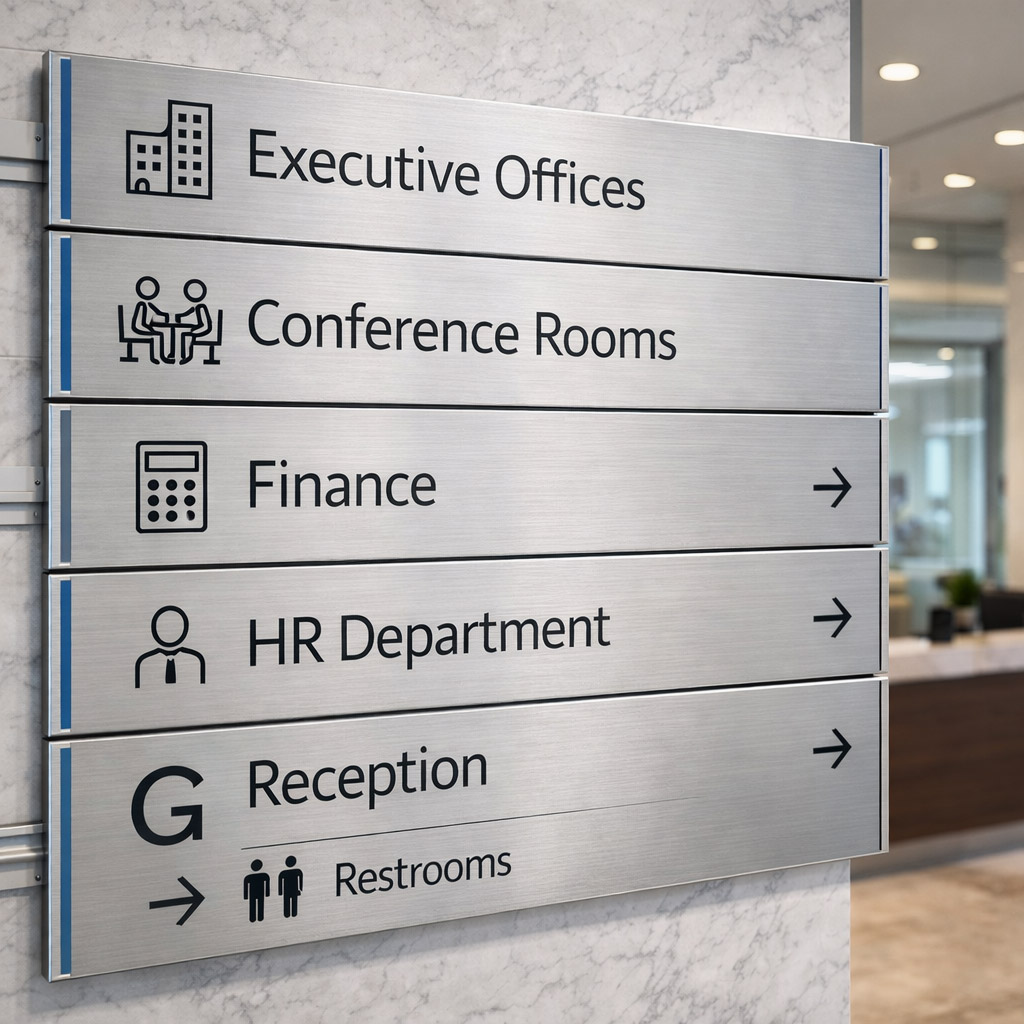 A sleek modular directory signage system installed on a marble lobby wall provides clear navigation for visitors and employees. Brushed aluminum panels, consistent typography, and minimal icons create a professional wayfinding solution suited for modern corporate offices.