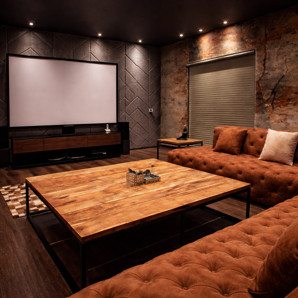 A bold art decor interior that blends textured geometric wall panels with rustic industrial finishes to create a sophisticated modern lounge atmosphere. Warm ambient lighting highlights the rich materials, making the space feel both stylish and inviting.