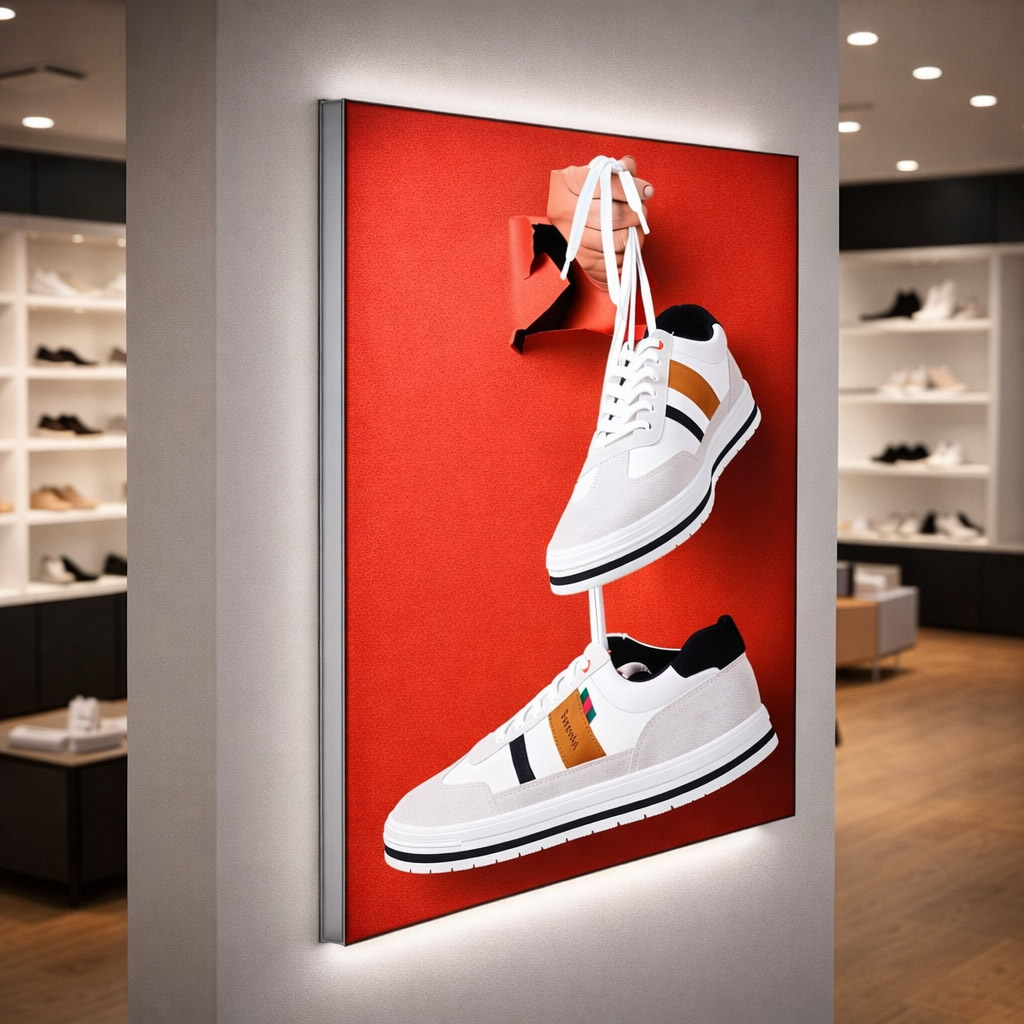 Premium SEG fabric lightbox showcasing a bold footwear graphic, designed to create a striking visual impact inside modern retail stores. The illuminated fabric frame delivers vibrant colors, seamless edges, and high visibility, making it ideal for premium shoe brand promotions.